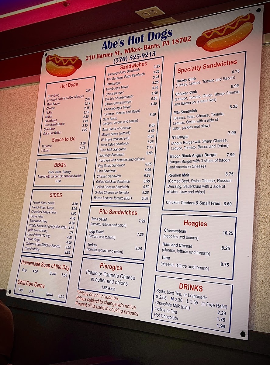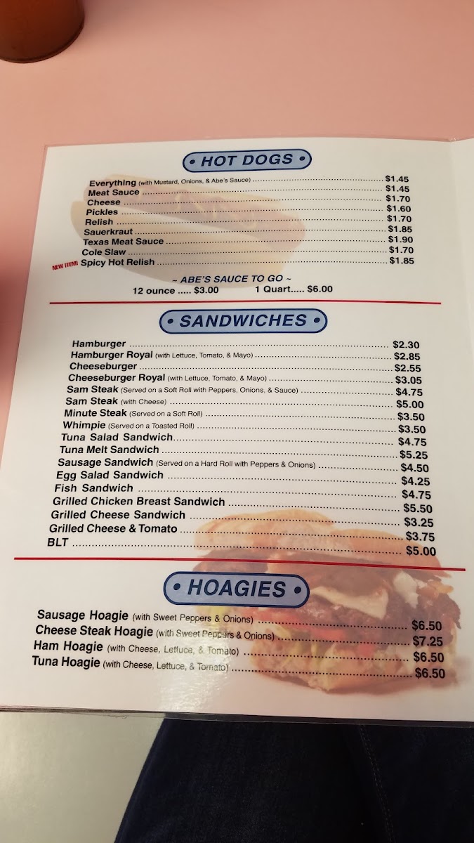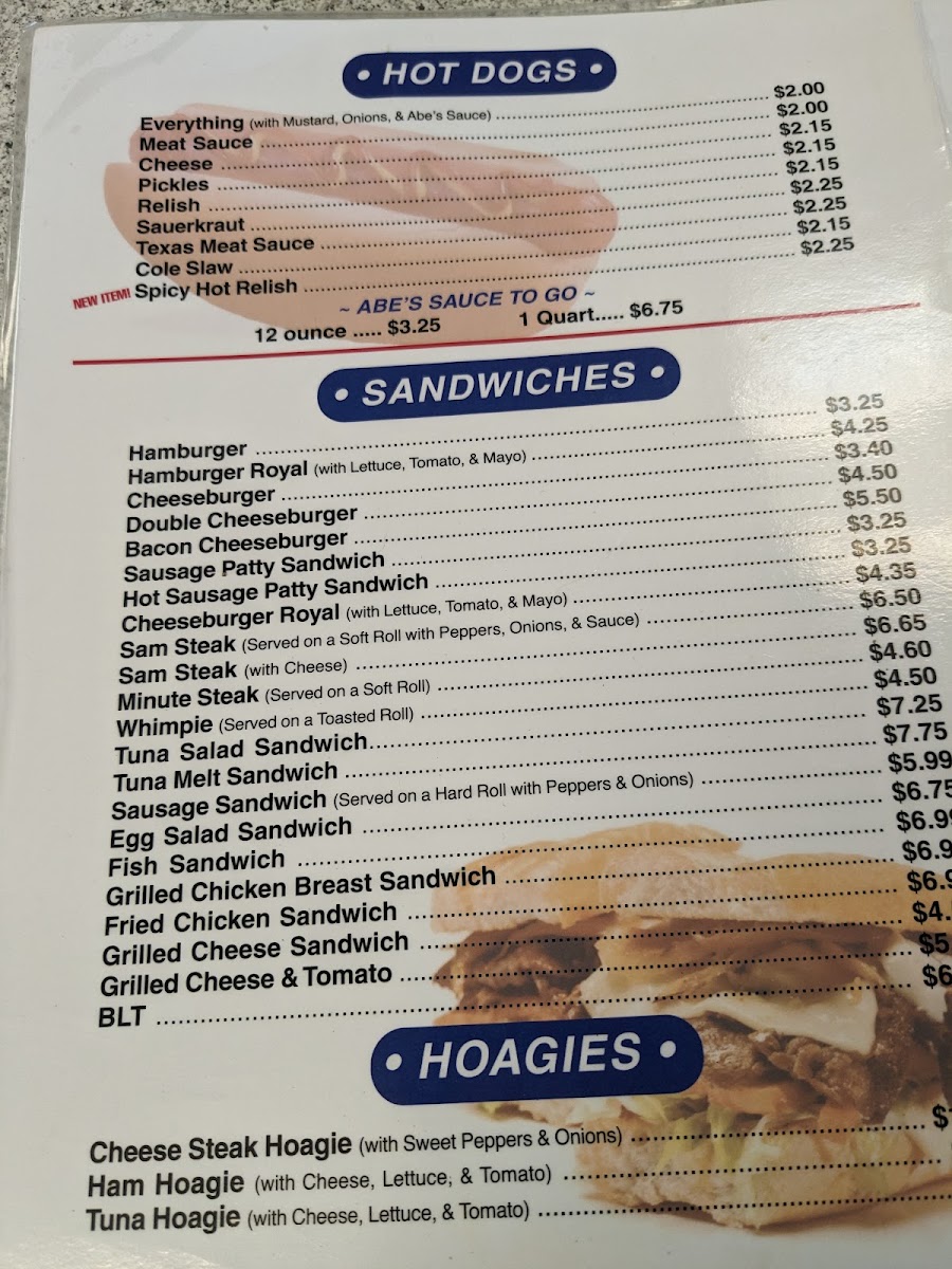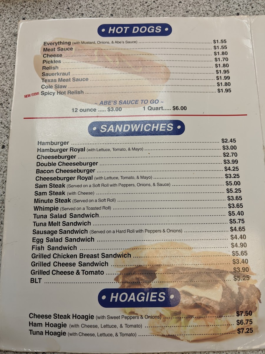 Abe's Hot Dogs offers a straightforward, comforting menu that fits perfectly with its classic 1950s diner atmosphere. The focus is on casual, satisfying bites that are easy to enjoy any time of day—whether you’re popping in for a quick lunch, a light dinner, or a relaxed weekend treat.