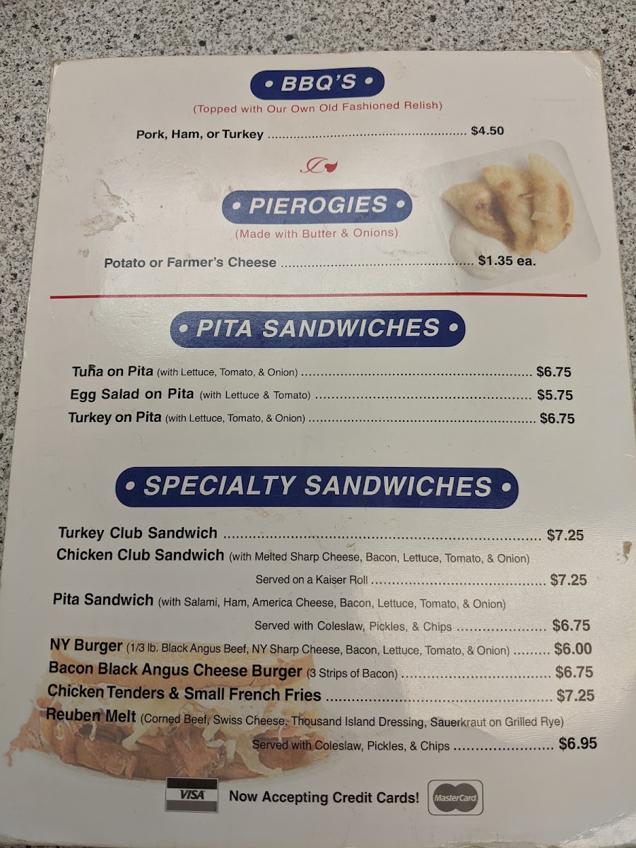 The menu centers around hot dogs with unique twists, like the celebrated Meat Sauce hot dogs and the Everything Hot Dog, alongside hearty sides such as Pierogies, Corn Nuggets, and Fries with Gravy. Sandwich options like the Tuna Pita and Reuben Melt add variety for those looking for something beyond the traditional dog.